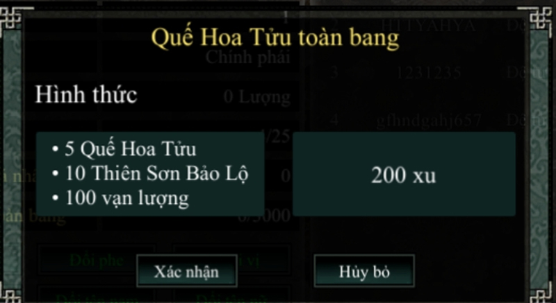 - Sau khi kích hoạt Quế Hoa Tửu Toàn Bang, các thành viên Bang Hội ở xung quanh sẽ được tăng 20 điểm may mắn trong vòng 30 phút.